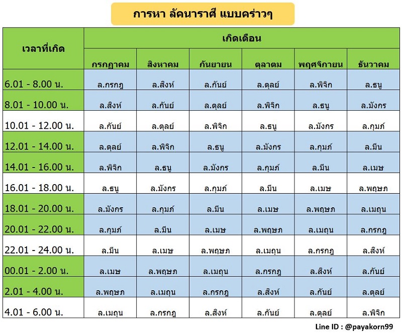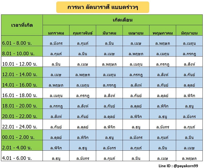 ตารางนี้ เป็นเพียงการหาลัคนาอย่างคร่าวๆ เท่านั้น ถ้าต้องการทราบลัคนาอย่างถูกต้อง 100% จะต้องมีการคำนวณอย่างละเอียดอีกที